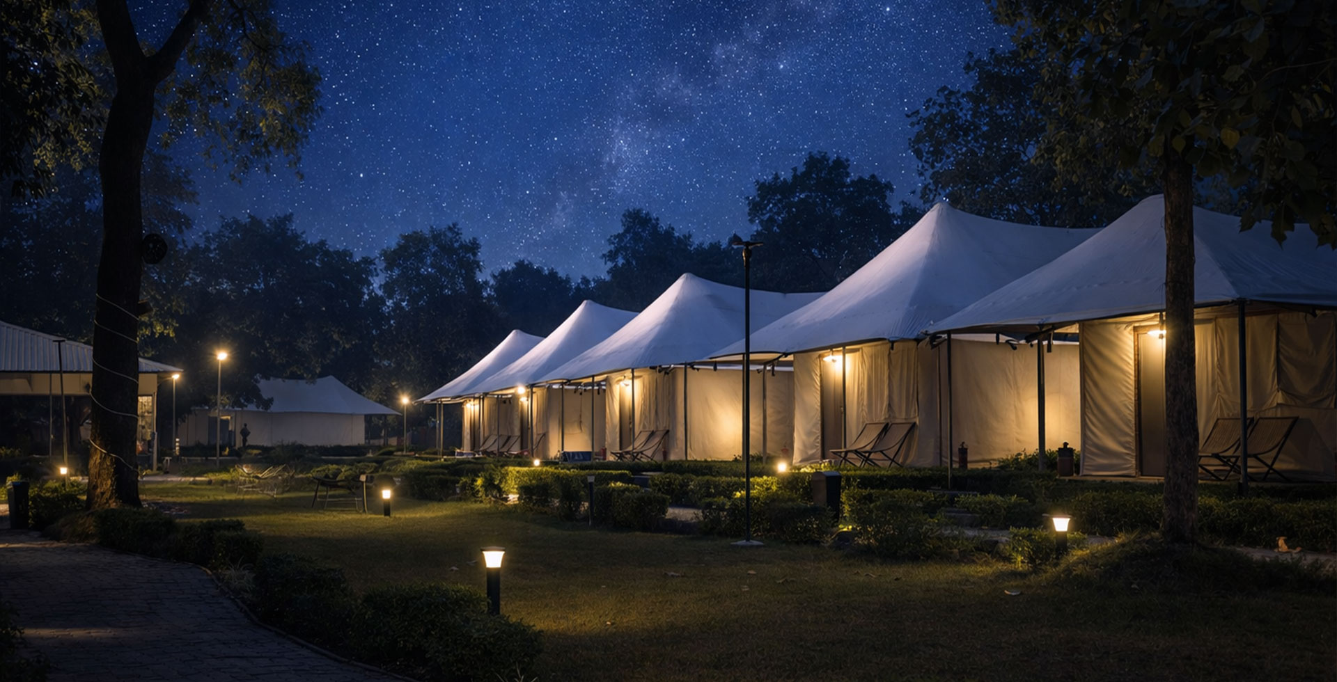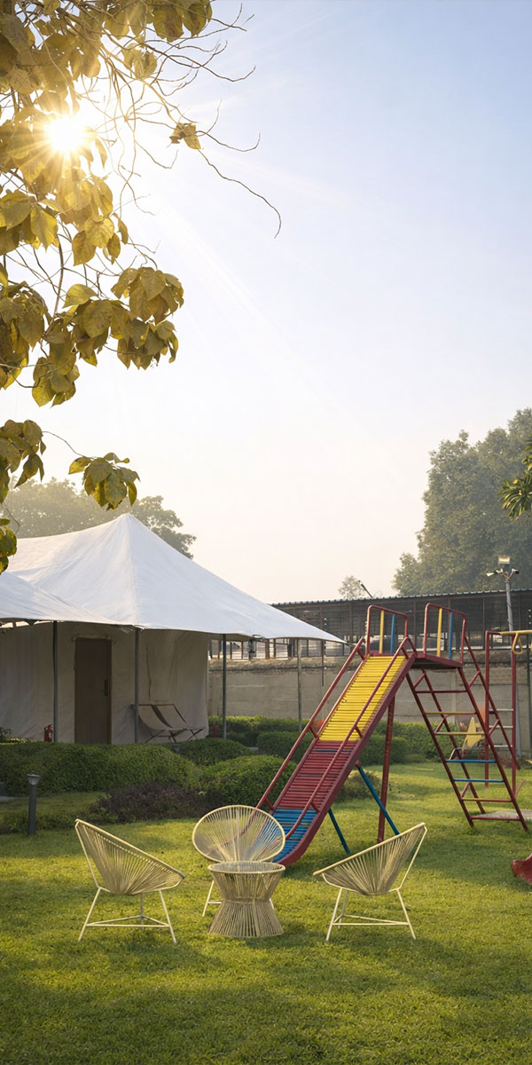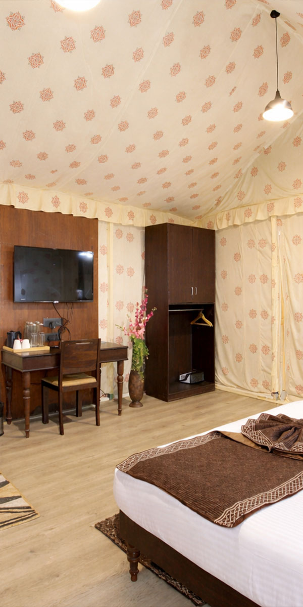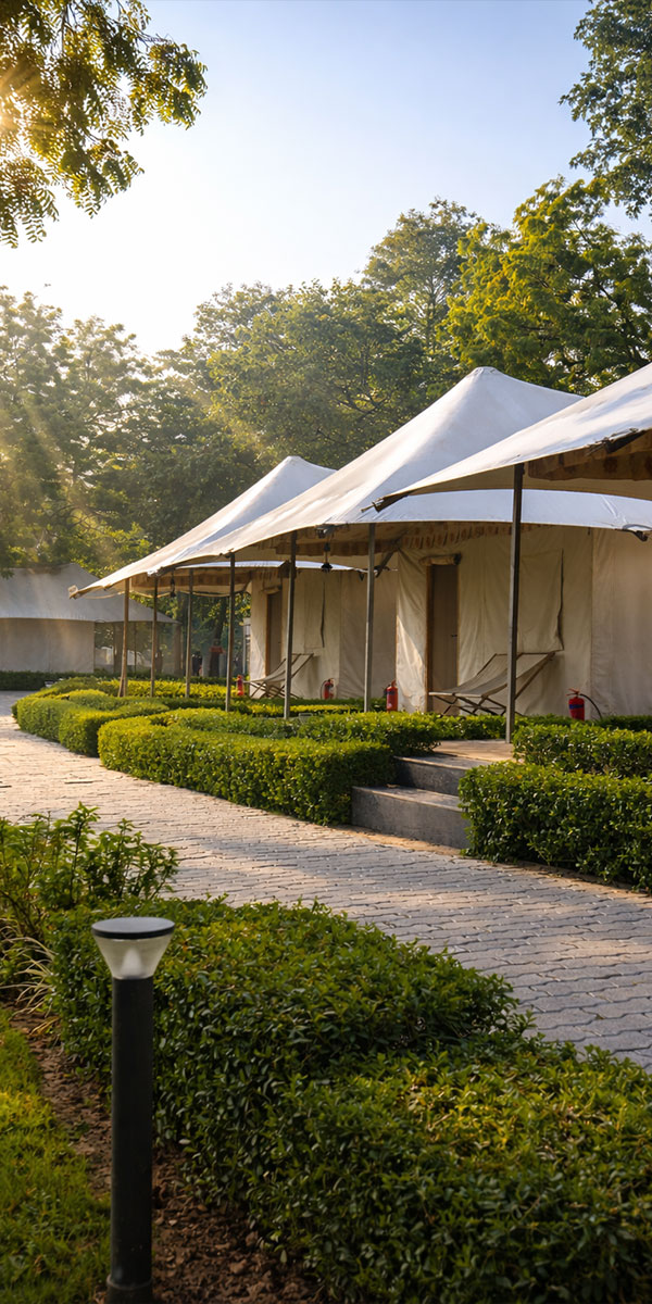 Stay in one of our 30 elegantly appointed, air-conditioned tents, where aesthetic interiors meet modern comforts. Savour authentic Avadhi vegetarian cuisine, enjoy vibrant cultural performances, explore our lush green lawns, and browse unique keepsakes at our souvenir shop — all thoughtfully curated to enrich your stay.