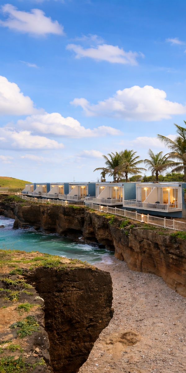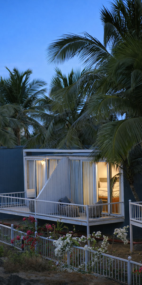 The 24 independent cottages and six elevated machans at Praveg Beach Resort are painted in soft shades of blue, a color commonly associated with the coast, and provide an opportunity for visitors to have a relaxing beach vacation while enjoying stunning ocean views. A glass wall overlooking the Arabian Sea offers visitors unobstructed views of the ocean. As the cottages are elevated above the rocky beach in front of them, they provide guests with front-row seats to the magic of the Arabian Sea, especially during sunset.