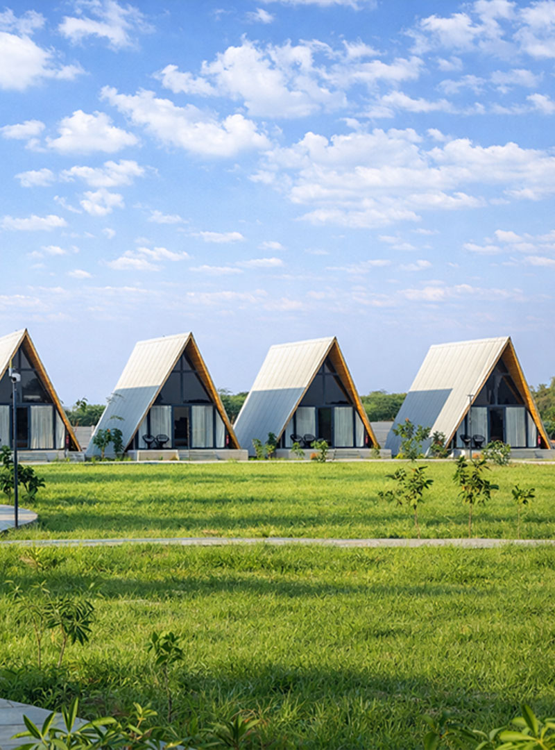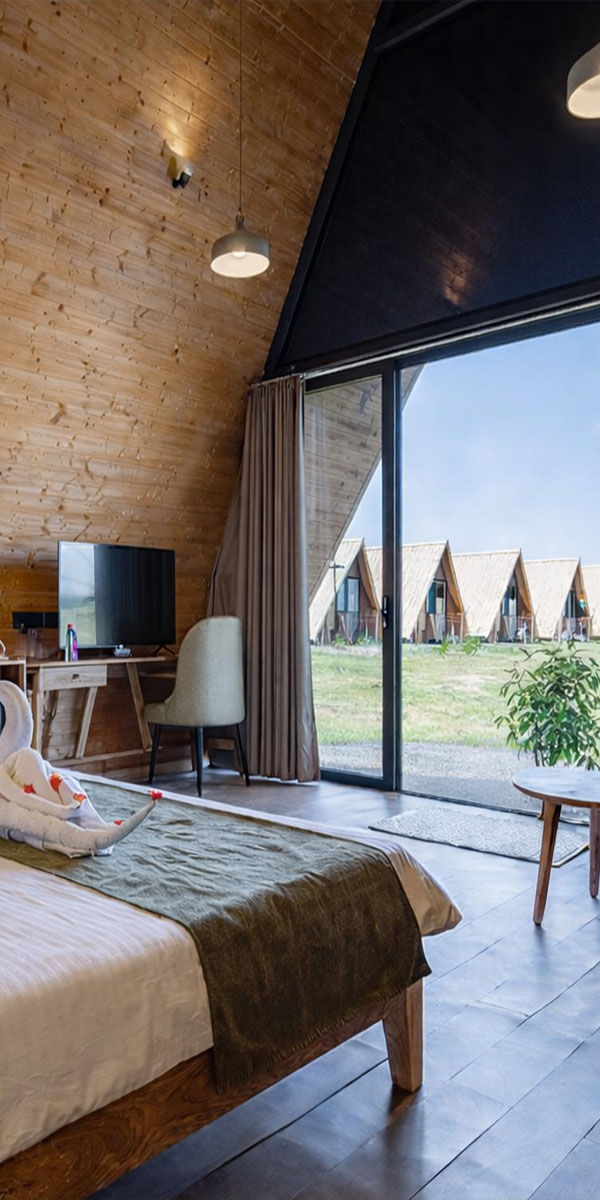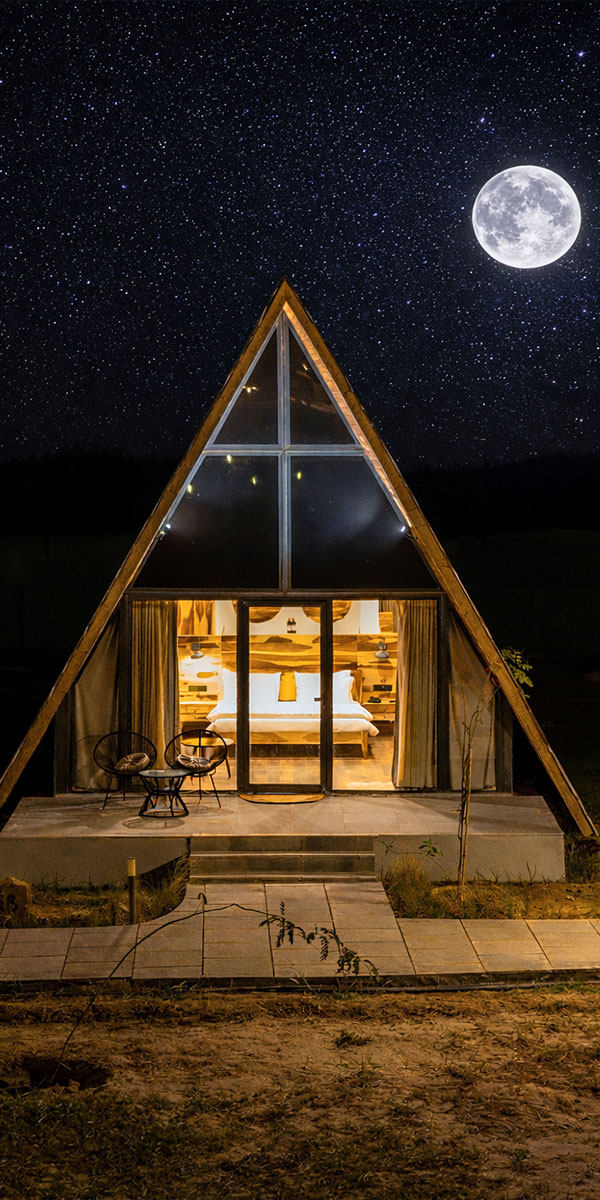Experience the charm of our 30 triangle-shaped ‘A’ frame cottages, soaring 20 feet high, with elegant interiors and glass walls that invite you to stargaze right from your bed. Each cottage includes a private porch area, perfect for soaking in the serene natural beauty of the surroundings.