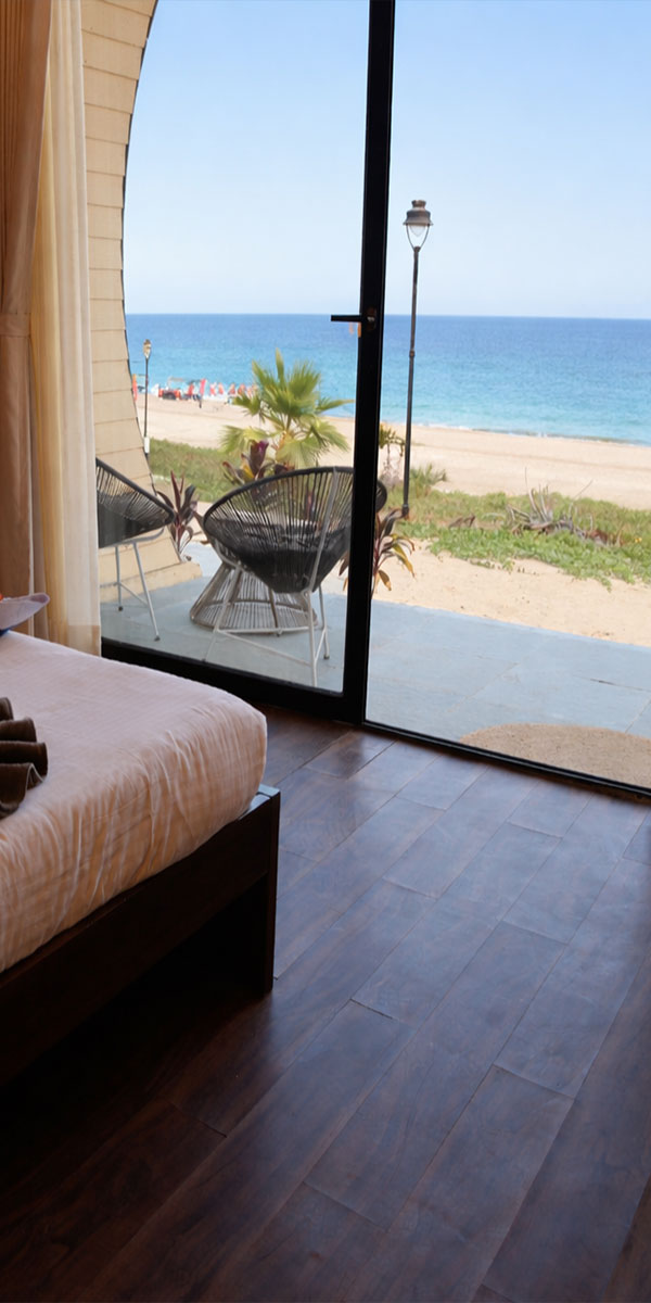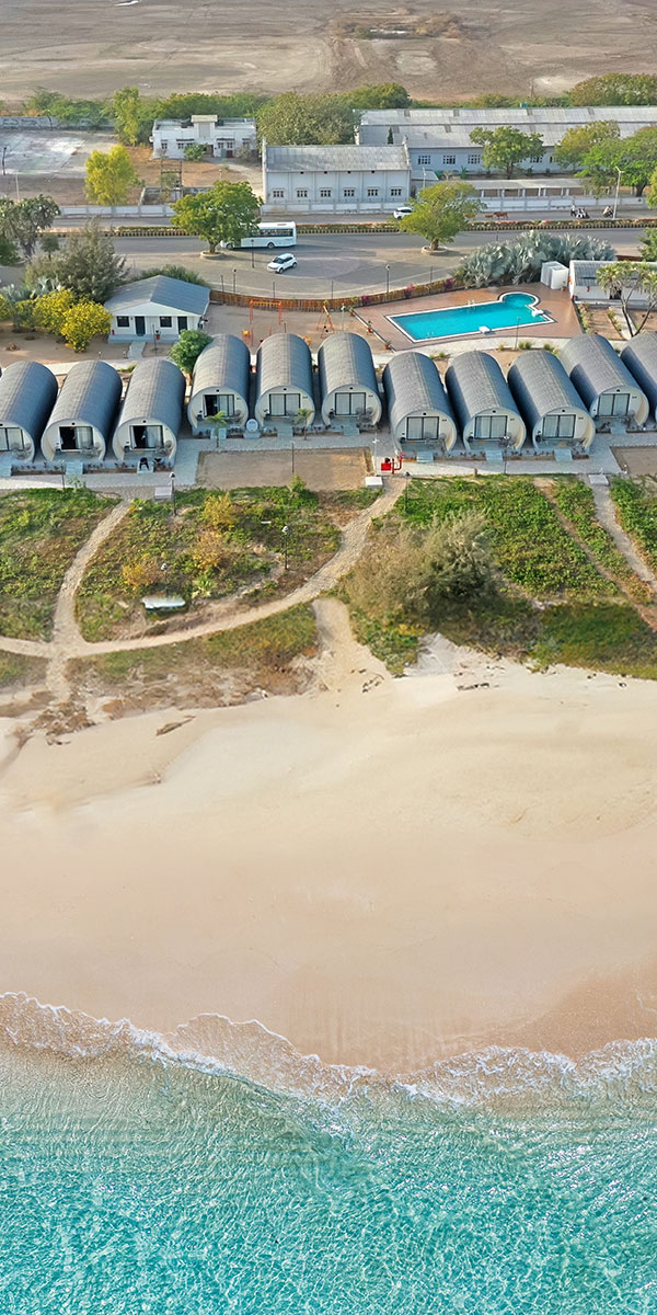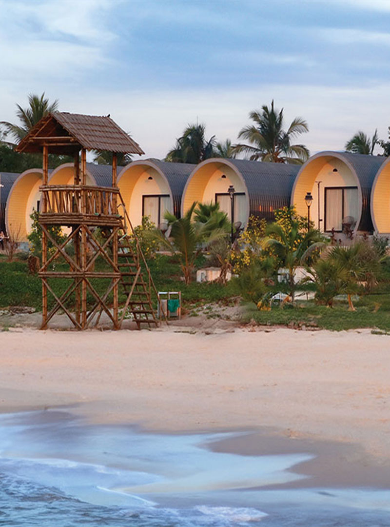 At Praveg Beach Resort Diu, there is a whole new way for you to stay with us, with a fabulous view of the ocean. This tropical location is located along the pristine Ghoghla Beach, a Blue Flag Beach, and is one of our locations to choose from when travelling to India or South-East Asia. Praveg Beach Resort features 35 uniquely designed hobbit-style wooden cottages that offer the best of everything, comfort, and creative design. Each cottage has sliding glass doors that open up to fantastic views of the ocean and beach and provide a seamless connection between luxury and the natural world.