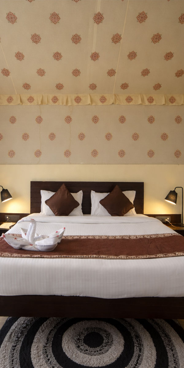 The resort offers 39 premium, beautifully furnished luxury tents that provide both a spiritual environment and modern conveniences such as air conditioning, Wi-Fi, housekeeping, and comfortable interiors to ensure a relaxing and comfortable stay.